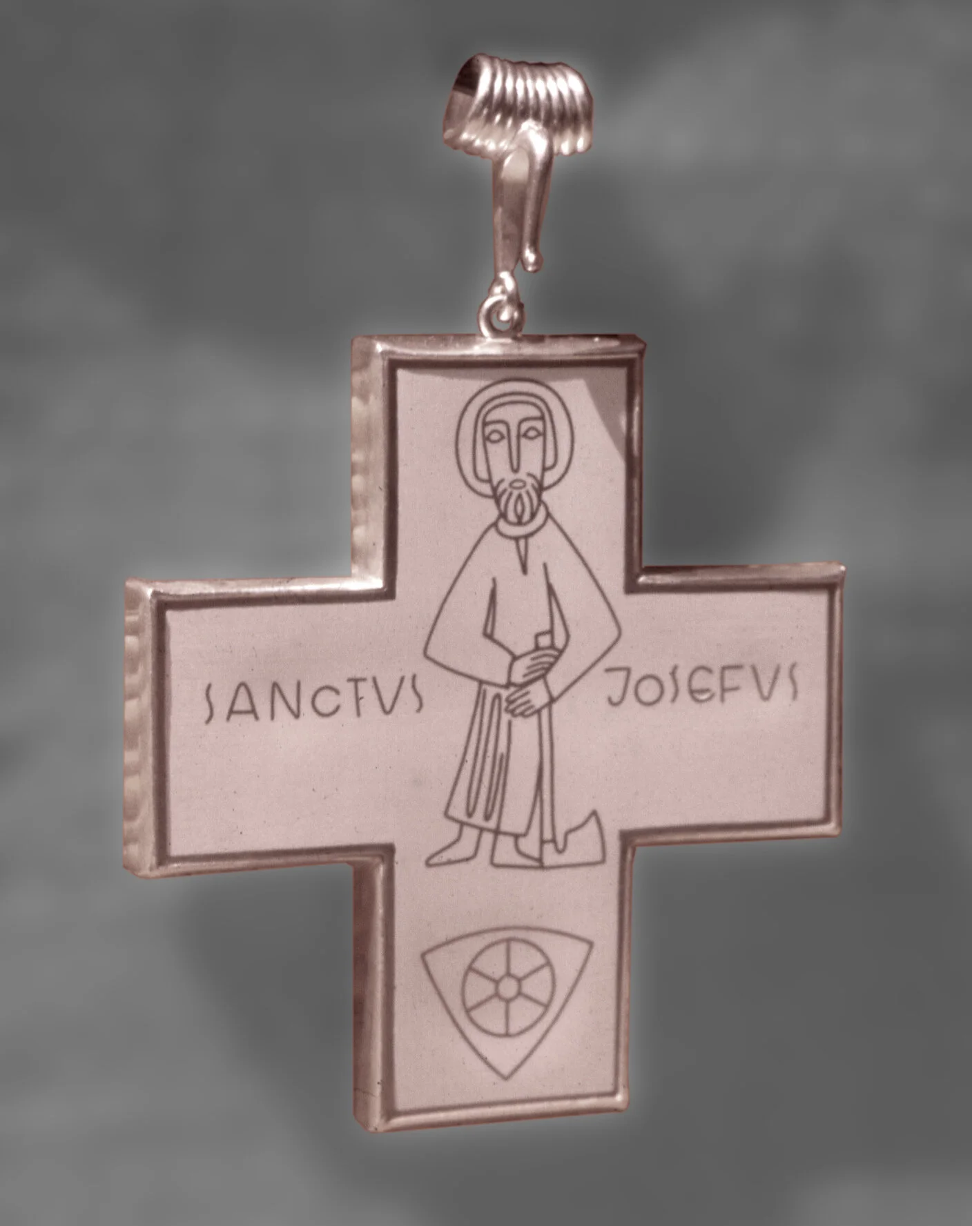 Auf der Rückseite St. Josef mit Zimmermannsbeil und die Schrift SANCTUS JOSEFUS sowie ein Rad (Wappen des Bistums Osnabrück) in weißem opakem Email.